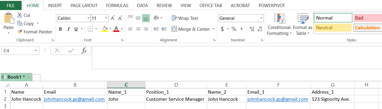 - Once your tags are in place and renamed, open up a Google Sheets or Excel spreadsheet to create your CSV list. In the first rows, add Name, Email, and any tag names that you want to pre-populate. Then in the following rows, enter the signer information. The name and email are the only columns that are mandatory. The example below gives you an idea of what can be done with the Bulk Sign CSV file.