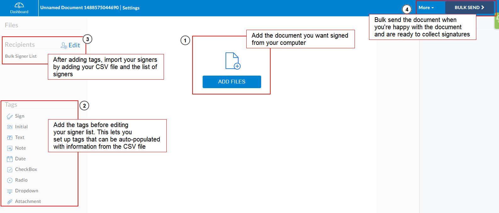 - Use the Add Files button to upload the document you want to bulk send for signatures.