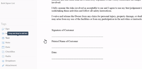 - Unlike Templates and Template Links, with Bulk Sign documents, you'll want to add the tags first. This is so you can pre-populate text tags from the CSV file listing your signers. Drag and drop the tags meant for the bulk signers and then open the tag settings using the cog icon above a selected tag. When you open the settings, change the name to something easily recognizable, like Name_1 or Position_1, for e.g.