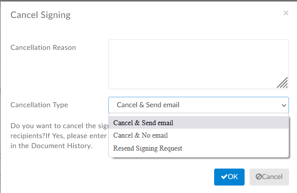 This will cancel the document's signing workflow. To use this option, you must input a cancellation reason. All recipients will receive an email notification that the document signing has been cancelled containing the cancellation reason. The document status will be changed to "Cancelled", and recipient editing access to the document will be removed. The cancellation reason will be included in the audit trail of the cancelled document.