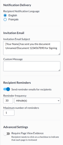 - You can then personalize the invitation email to your signers by changing the email subject line and body message to suit your needs. You can also customize an email reminder schedule and set up capturing page view evidence from your signers on the right panel.