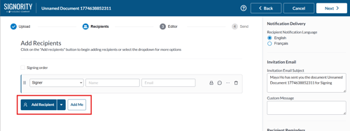 - On the Recipients page, select Add Recipients and enter their names and email addresses, or if you will be a signer, you can simply select Add Me to add yourself.