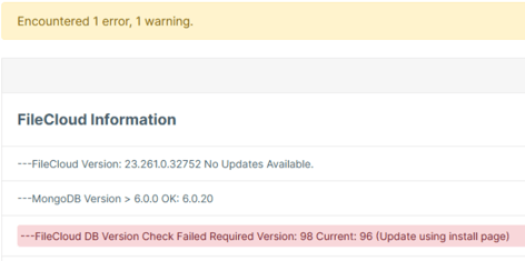 - This could happen if MongoDB did not update successfully, or the correct scripts to upgrade the FileCloud Server in a Linux environment were not used.
