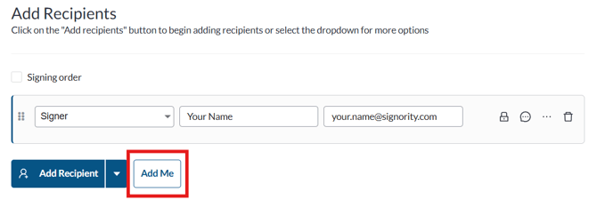 - On the Recipients page, click Add Me to add yourself as the signer. Signority will pre-populate your information as the recipient's information.