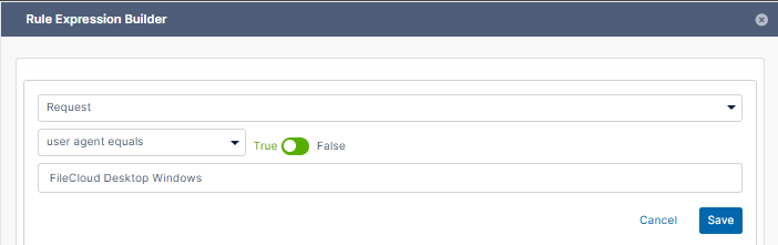 The available documentation and the Rule Create Help in the Admin Portal >> Smart DLP >> Update/Create Rule page does not list a _request.agent parameters when using FileCloud Desktop for Windows and Mac.