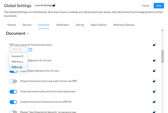 *Note: Available for enterprise plans. (Inquire with sales about enabling this feature.) To save documents as a PDF/A file once it is completed, open Signority, then navigate to the 'Admin Console' and go to 'Settings.' The Global Settings pop-up will appear, and under the 'Document' section, select the dropdown for 'PDF type output for finalized documents'. Choose PDF/A-2b and click save in the top right.