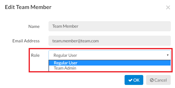 You can also edit the roles of team members if necessary. You can give a user Super Admin, Team Admin capabilities. Go to the Team page and select a team member. Click the Edit option and in the window, use the drop-down menu next to Role to edit their account access.