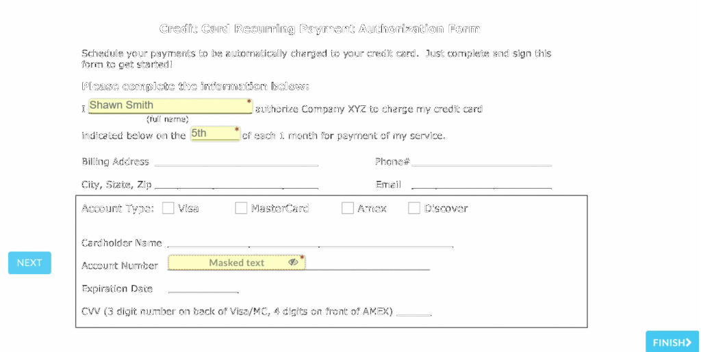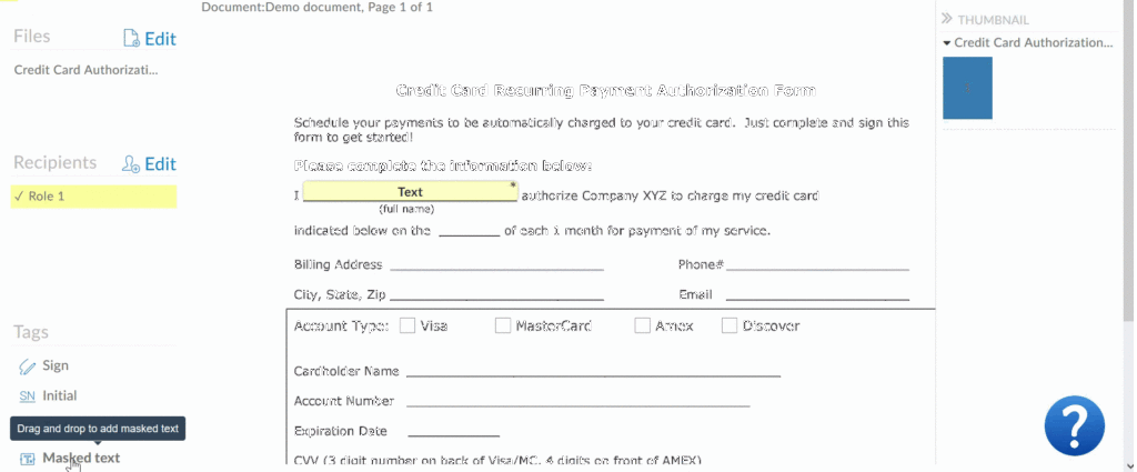 Sending out a document with a secure masked field works the same way as any other document. On the recipient side, a recipient can enter in the requested information into the tag area. Once the recipient clicks away from the tag, any content entered into it will be hidden with the tag’s name, followed by asterisks. At any point in time before finalizing the document, the recipient can click the tag, review the information that was entered, and edit as needed.
