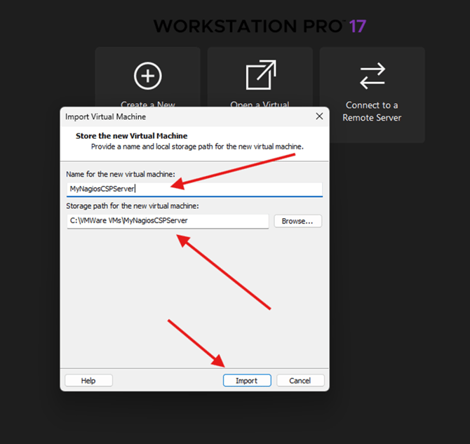 - Type the virtual machine’s name and the path where its files will be stored. Click on the “Import” button:
