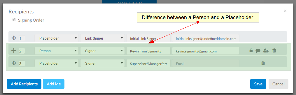 Initial Link Signer. This is the person who clicks on the generated URL to access the document and initiates the signing process. Also, when adding other signers, you can set them as either a Person or a Placeholder. As shown below, a