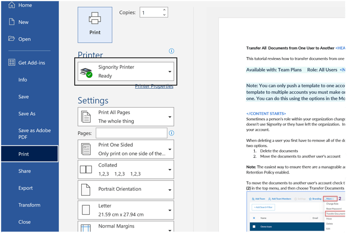 To use Print Driver, open the document you want to load into Signority from your desired Windows application. In this tutorial, we will be using Microsoft Word. In the application, select print and then choose "Signority Printer" as the printer. Adjust your print settings as desired before pressing "Print".