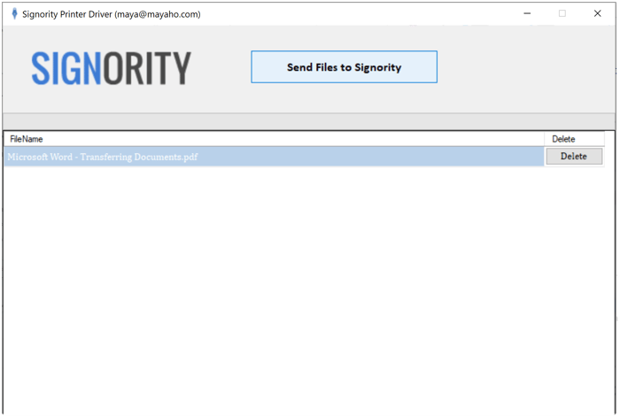 Signority's Printer Driver will then open and prompt you to sign in to your Signority account. Once you are on the printer driver, you can select "Send Files to Signority." This will redirect you to the Signority platform editor page where you can change the settings, add recipients, and add tags, just as you would with a Regular Document.