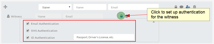 - The witness signer's name and email are unknown to the sender, so you must set up an authentication method by clicking on the Lock icon and select the authentication method you like: email, SMS, and/or ID. This allows you to validate their identity. Click 'Next' or 'Design my documents' when you're done. Note that for ID authentication, you must specify what kind of ID information you want from the witness.