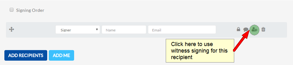 - There are four icons to the right of a recipient, click the third (a person with a + symbol) icon next to the signer that needs a witness.