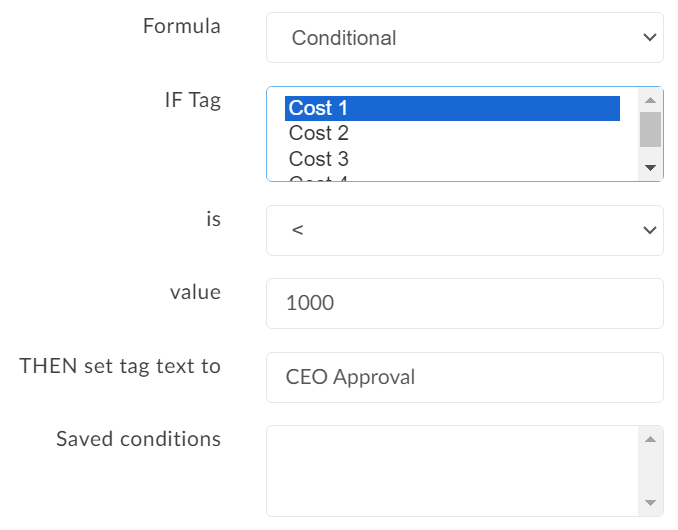 This conditional formula says: if the tag named "Cost 1" is greater than 1000, then set the tag to contain the text "CEO Approval".