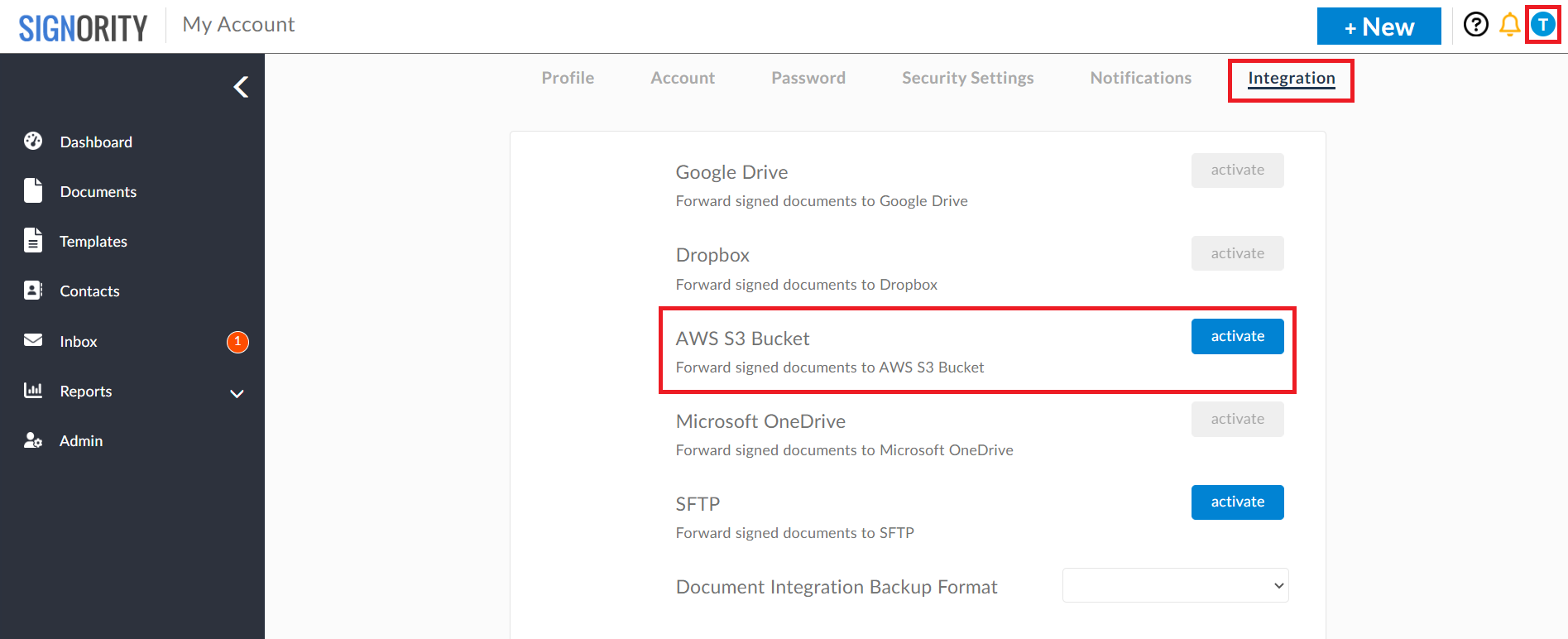 Click on the Integration tab then click on Activate next to AWS S3 Bucket.