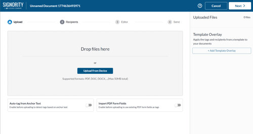 Note: If you if you have a document that has PDF form fields↗ or anchor text↗, you can select those options first before uploading your document. This will let the system know to upload while searching for those options. -