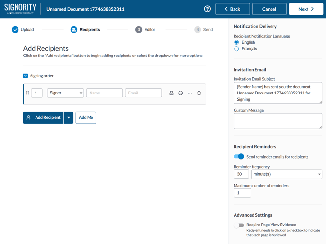 - [Optional] You can also create a signing order by selecting the Signing Order checkbox and reordering the recipients by either dragging them or typing in their order number. This allows you to create a sequence for your signers and further customize the workflow to fit your needs.