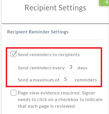 - On the right of the Recipients page, under Recipient Reminder Settings, select the checkbox next to "Send reminders to recipients"