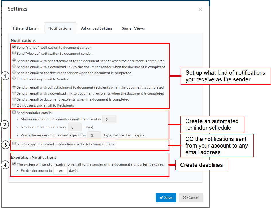- Adjust the the documents notifications and expiration as needed.
