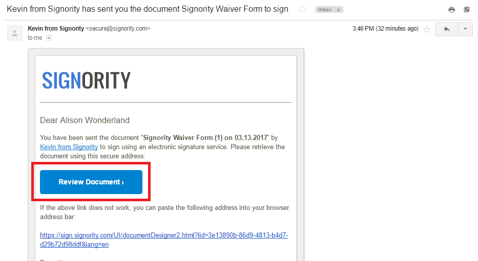 As the signer, you will need to first access the document by opening your inbox and finding the invitation email from the sender. It should look something like this.