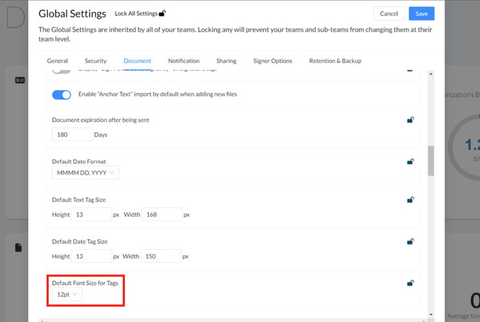 - Under Document, select the dropdown for 'Default Font Size for Tags'