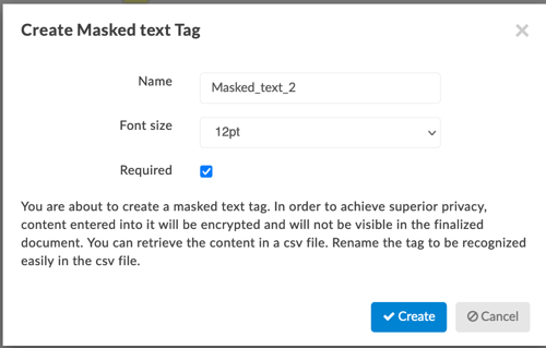 Once you drag and drop the tag, a popup window will appear, prompting you to change the name of the Masked Text Tag to something more recognizable. This is especially important if you are requesting more than one piece of sensitive information, since you will be retrieving the masked information through a .csv file.
