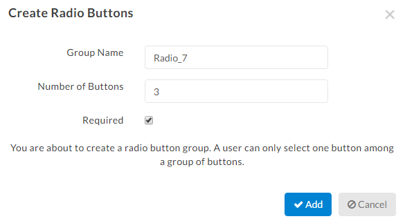 When you drag a radio button over, you'll first be asked how many buttons will make up the group. The signer can only select one out of that grouping of radio tags. You can tell which radio tags are grouped together because the name of each tag will be the same. This means that if you entered the wrong number of buttons, you can add more by changing the names of the radio tags from the 2nd group to match the first.