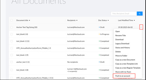 - In your documents folder, find the document you wish to transfer and select the dropdown menu on the far right of the document name. In this tutorial, we will transfer the document ‘Anchor Text Tag Sizing (20)’.