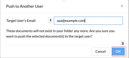 - In the window that appears, enter the username (email) of the user whose account you want to push the document to (1), and then click OK (2).