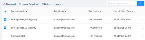- In your documents folder, check the box beside each document you want to transfer to another user. In this tutorial, we will be transfering “Bulk Sign Test_Liz Signority” and “Bulk Sign Test_Bob Signority”. The document action menu will appear at the top left of the document list.