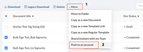- In the action menu, hover over 'More' (1)and a submenu will appear. In that submenu, select 'Push to an Account' (2).